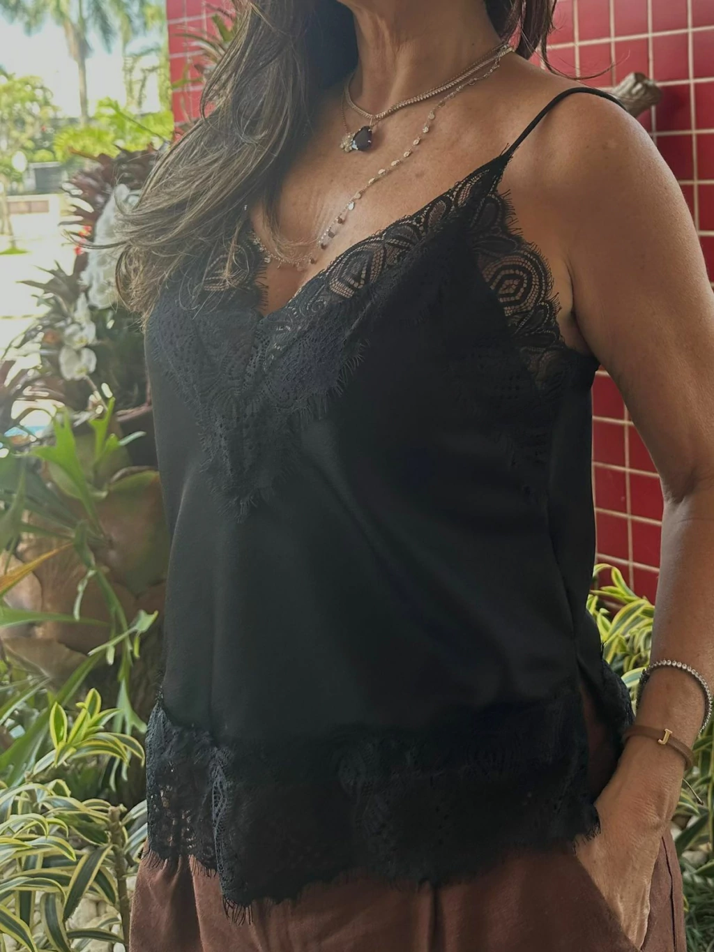 Descubra a elegância e o charme da nossa Blusa com rendas estilo lingerie, uma peça que une delicadeza e sofisticação. Com regulagem nas alças, ela se ajusta perfeitamente ao seu corpo, realçando sua silhueta com conforto. Os detalhes em renda conferem um toque sensual e moderno, tornando esta blusa perfeita para diversas ocasiões e looks. Valorize seu estilo com uma peça versátil e cheia de personalidade!
